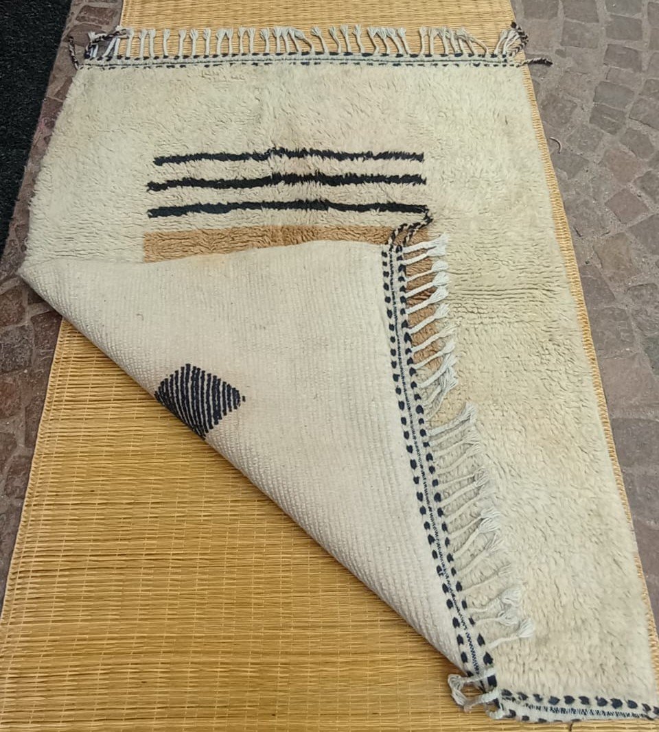 This authentic Beni Ourain rug is a handwoven piece of art, crafted from natural wool in the Atlas Mountains of Morocco. Its cream base is beautifully accented with geometric motifs: a bold black diamond, a soft pink block, and minimalist black stripes. The blend of traditional Berber weaving with modern abstract design makes it a timeless and versatile piece for any interior.