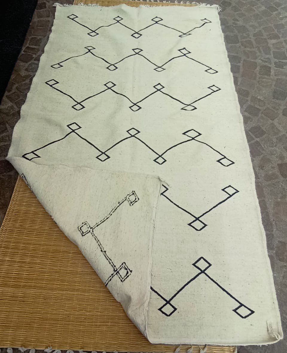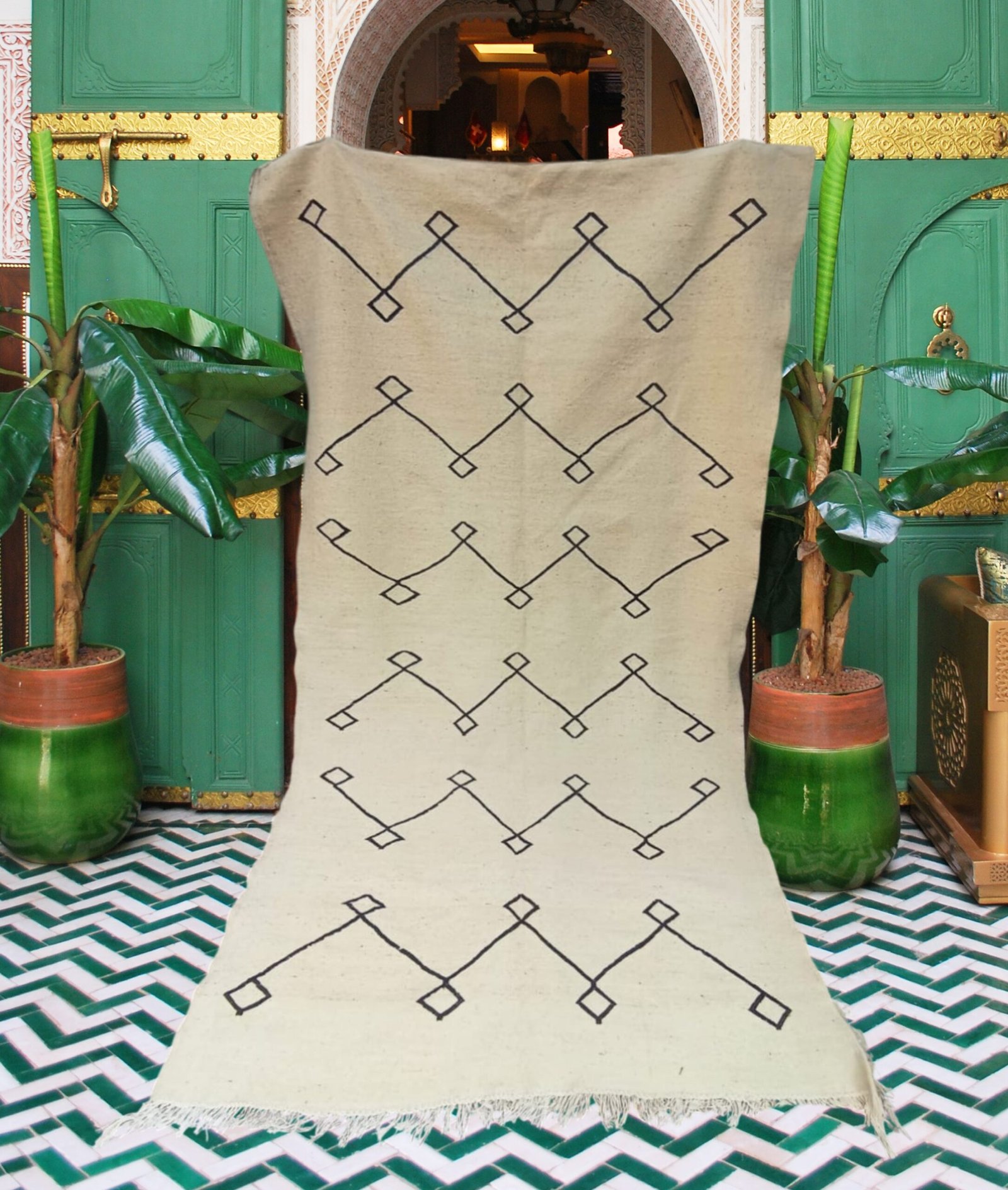 This authentic Beni Ourain rug is handwoven by skilled Moroccan artisans using pure wool. Its unique geometric pattern with diamond-inspired motifs adds a modern touch while preserving traditional Berber heritage. With its soft texture and minimalist design, it brings warmth and elegance to any living space.
